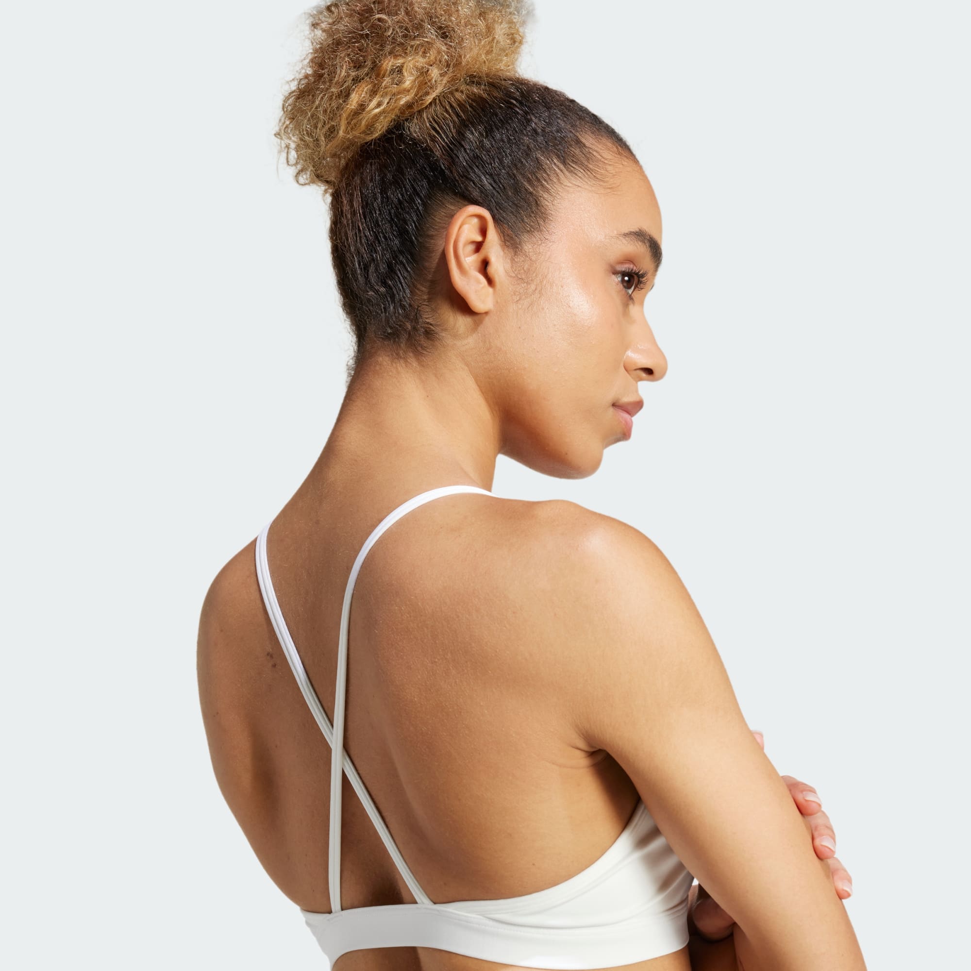 Une brassière de sport à maintien léger, conçue en partie à base de matériaux recyclés.