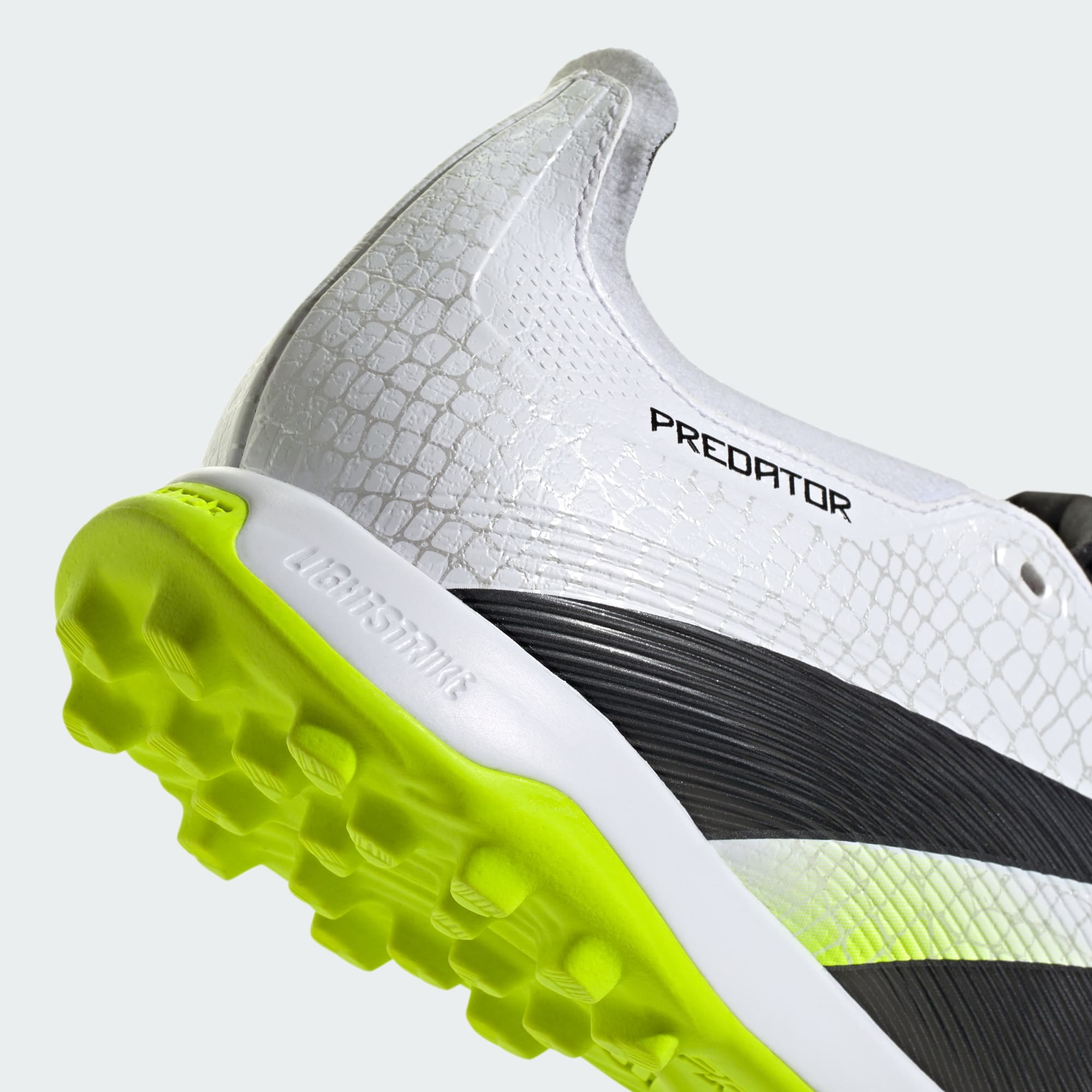 Découvre la différence entre vouloir marquer et savoir que tu vas le faire grâce à cette chaussure adidas Predator conçue pour faire trembler les filets. Cette chaussure League possède une tige Hybridfeel, une texture 3D intégrale, une languette rabattable et des ailettes Strikescale adhérentes pour t'aider à contrôler le ballon lors de tes frappes. La semelle intermédiaire Lightstrike et la semelle extérieure en caoutchouc à ergots te permettent de rester confortable et stable sur terrain turf.