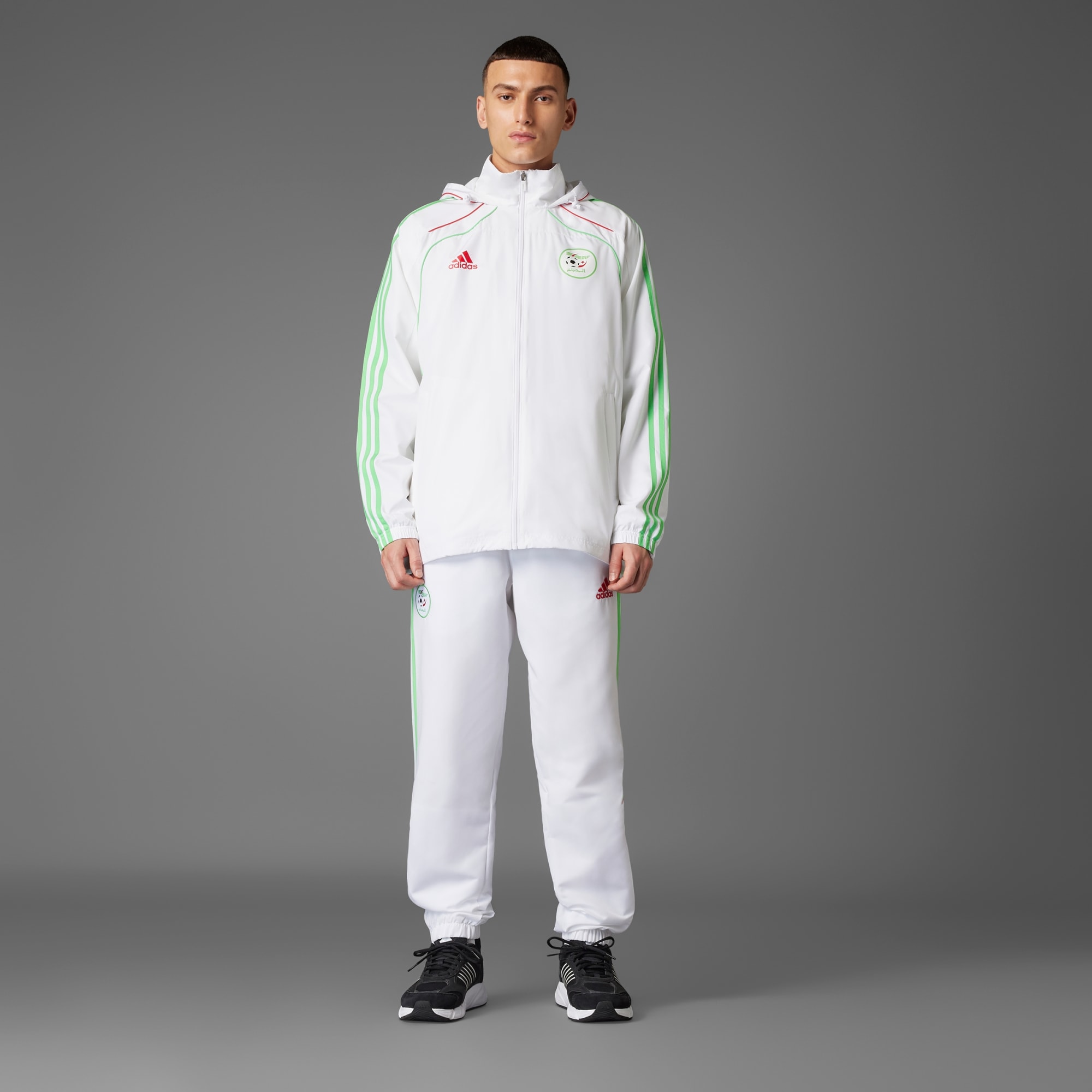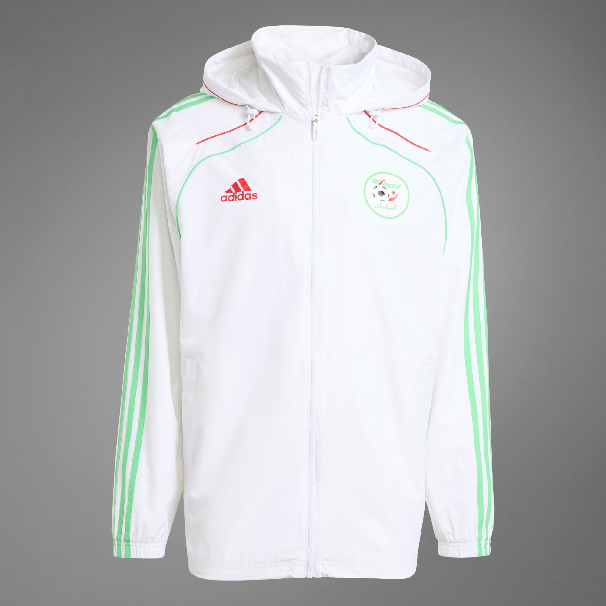 Représente l'équipe nationale d'Algérie quand les éléments se déchaînent. Ce coupe-vent adidas te permet d'afficher ton soutien tout en t'offrant un maximum de confort par temps venteux. Il possède des poches zippées pour ranger tes effets personnels. Orné du blason de l'équipe imprimé sur le ripstop doux, il arbore des liserés qui rendent hommage aux tenues de football des années 2010. Ce produit est conçu avec des matériaux 100 % recyclés. En réutilisant des matériaux déjà créés, nous contribuons à réduire les déchets et notre dépendance aux ressources limitées, afin de réduire l'empreinte écologique des produits que nous fabriquons.