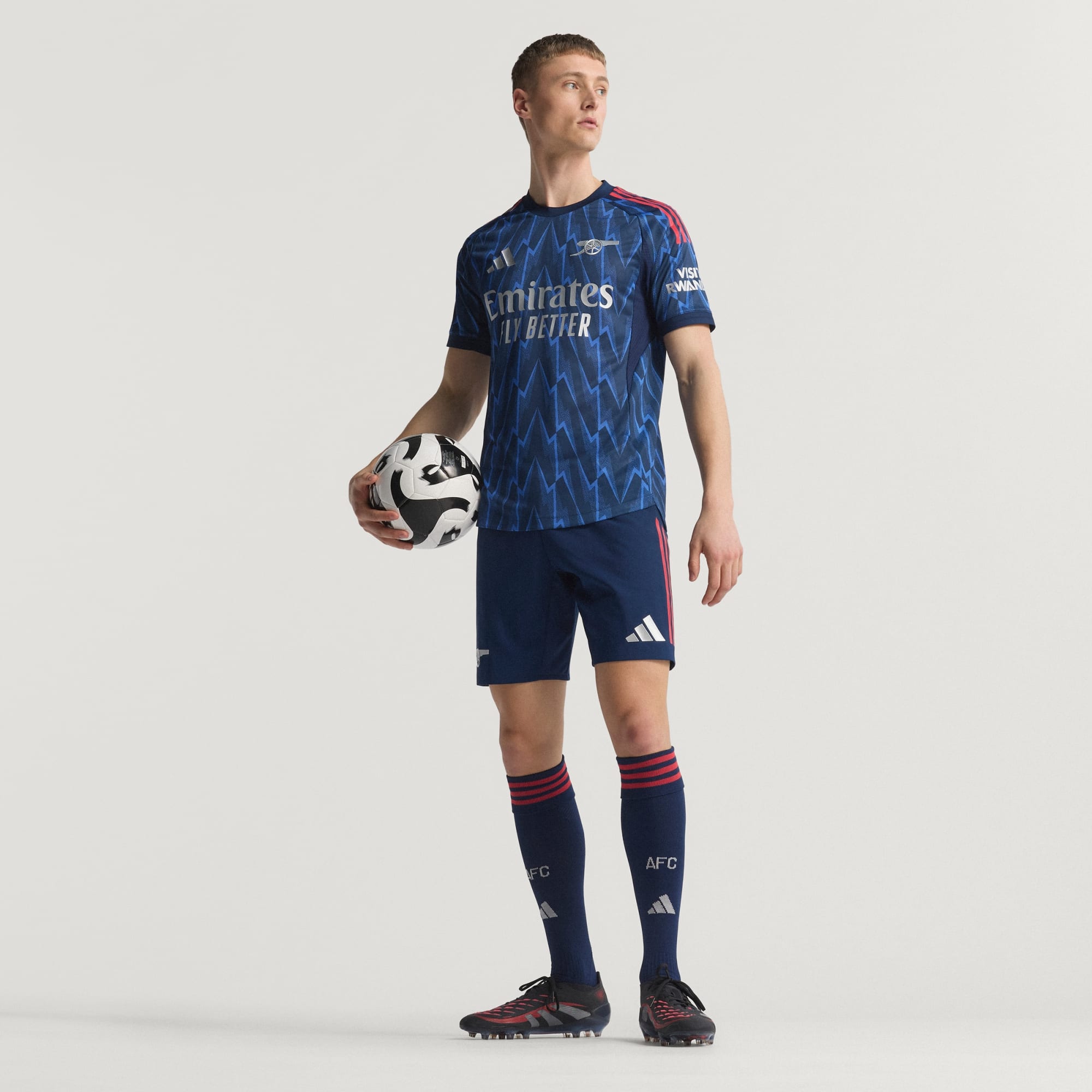 L'éclair d'Arsenal frappe à nouveau avec un twist moderne, créant un maillot extérieur original avec une base bleu marine et des détails rouges.