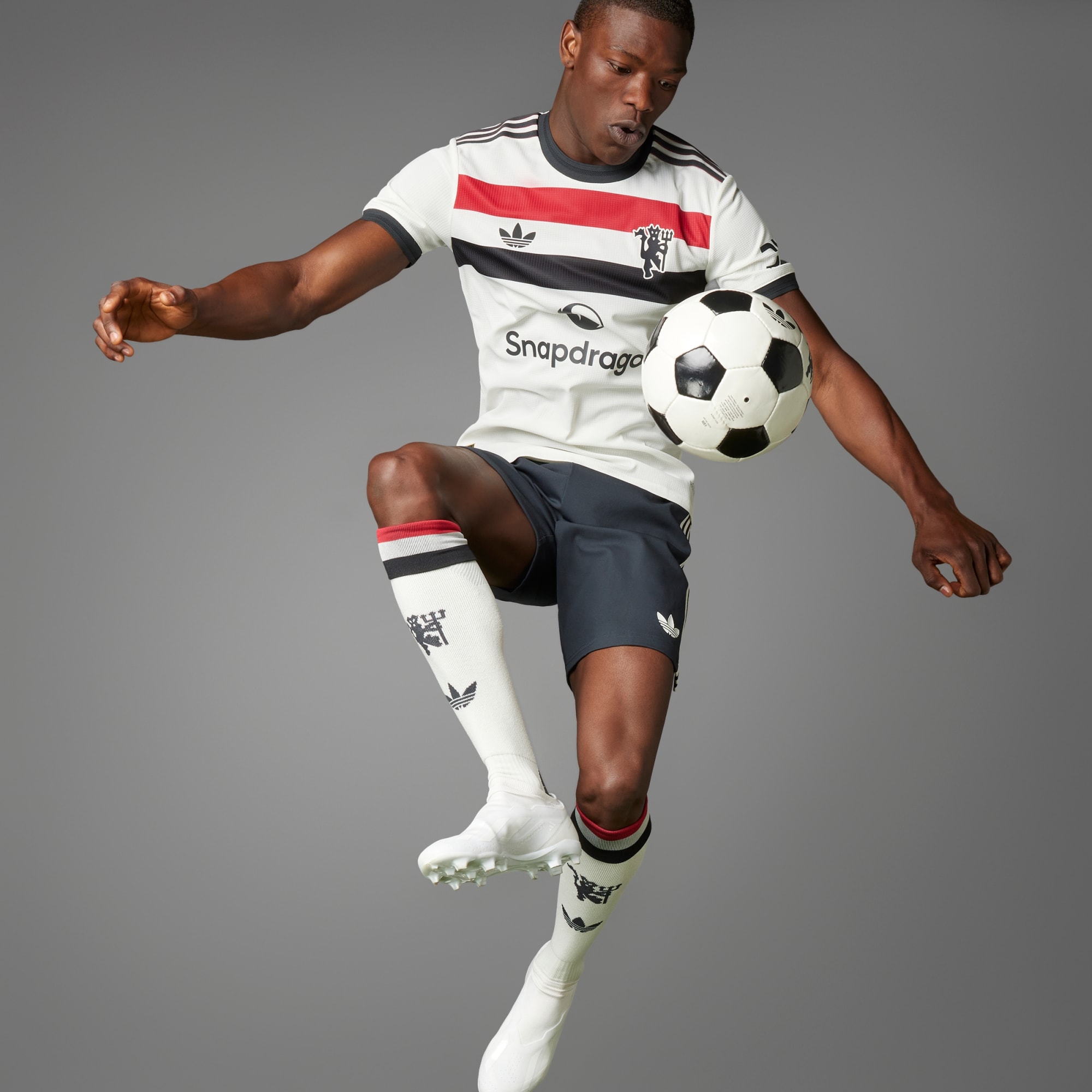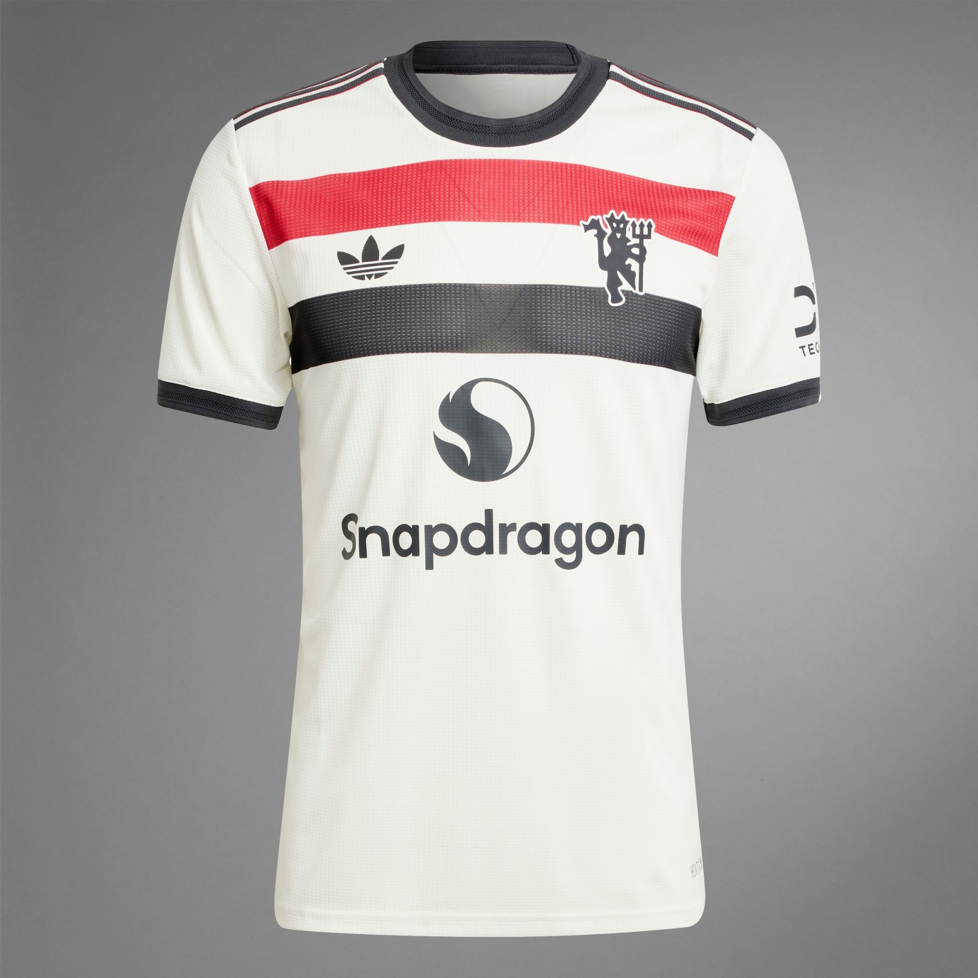 Soutiens ton club de football favori sans faire de compromis sur le style. Ce maillot Third de Manchester United authentique est inspiré des drapeaux qui suivent le club lors des matchs à domicile et à l'extérieur, tout en ajoutant une touche adidas classique. Un logo Trèfle et un badge de diable rouge rehaussent la bande tricolore sur la poitrine pour un look sport. La technologie HEAT.RDY te garde au sec quand tu encourages les joueurs à fond. Ce produit est conçu avec des matériaux 100 % recyclés. En réutilisant des matériaux déjà créés, nous contribuons à réduire les déchets et notre dépendance aux ressources limitées, afin de réduire l'empreinte écologique des produits que nous fabriquons.
