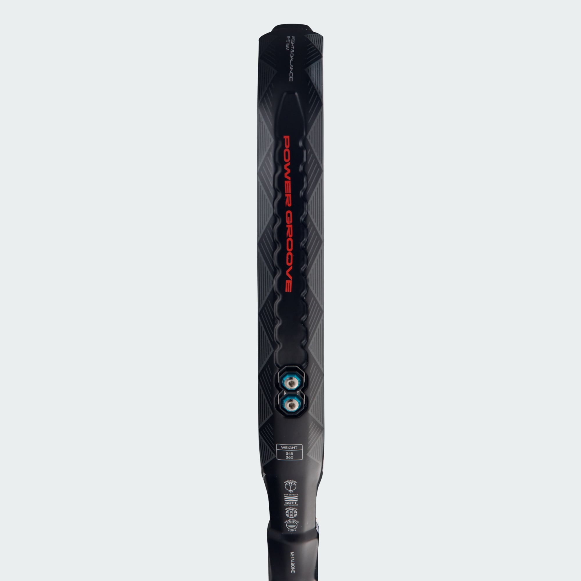 - Rail Power Groove inséré dans le profil de la raquette, avec relief Spin Blade Decal.