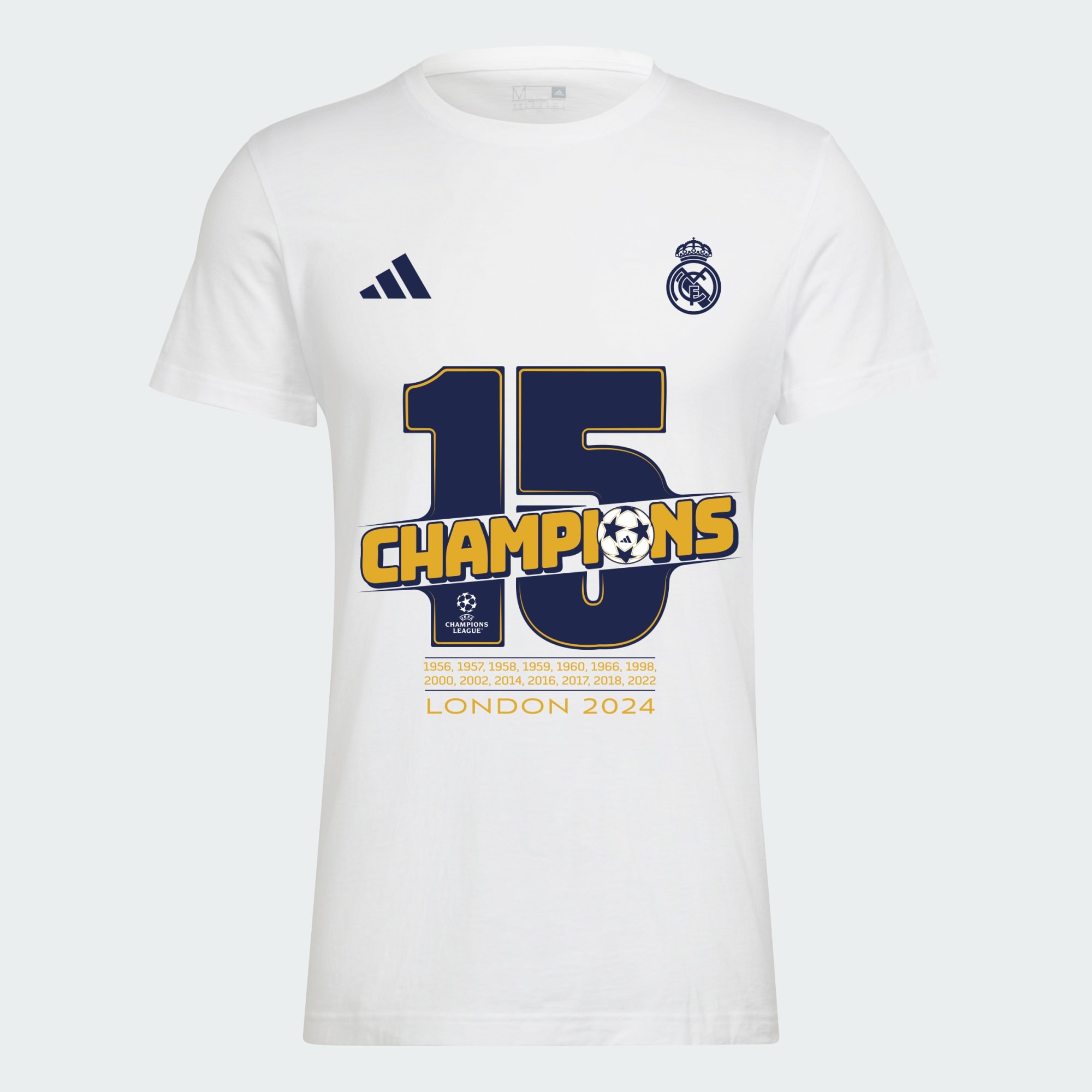 Pull on this comfortable football tee to celebrate Real Madrid's latest UCL triumph. Cut from soft, lightweight cotton, this adidas top will make the perfect memento for the club's Wembley win. A bold graphic on the back shows your pride in the 15-time champions of Europe.