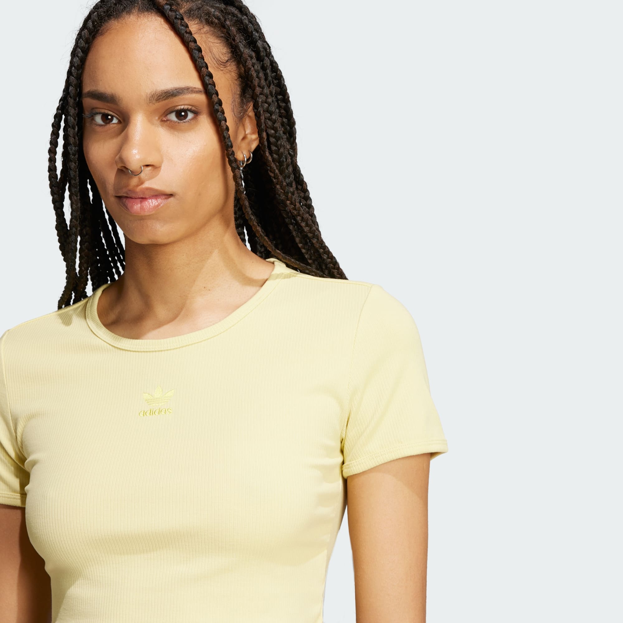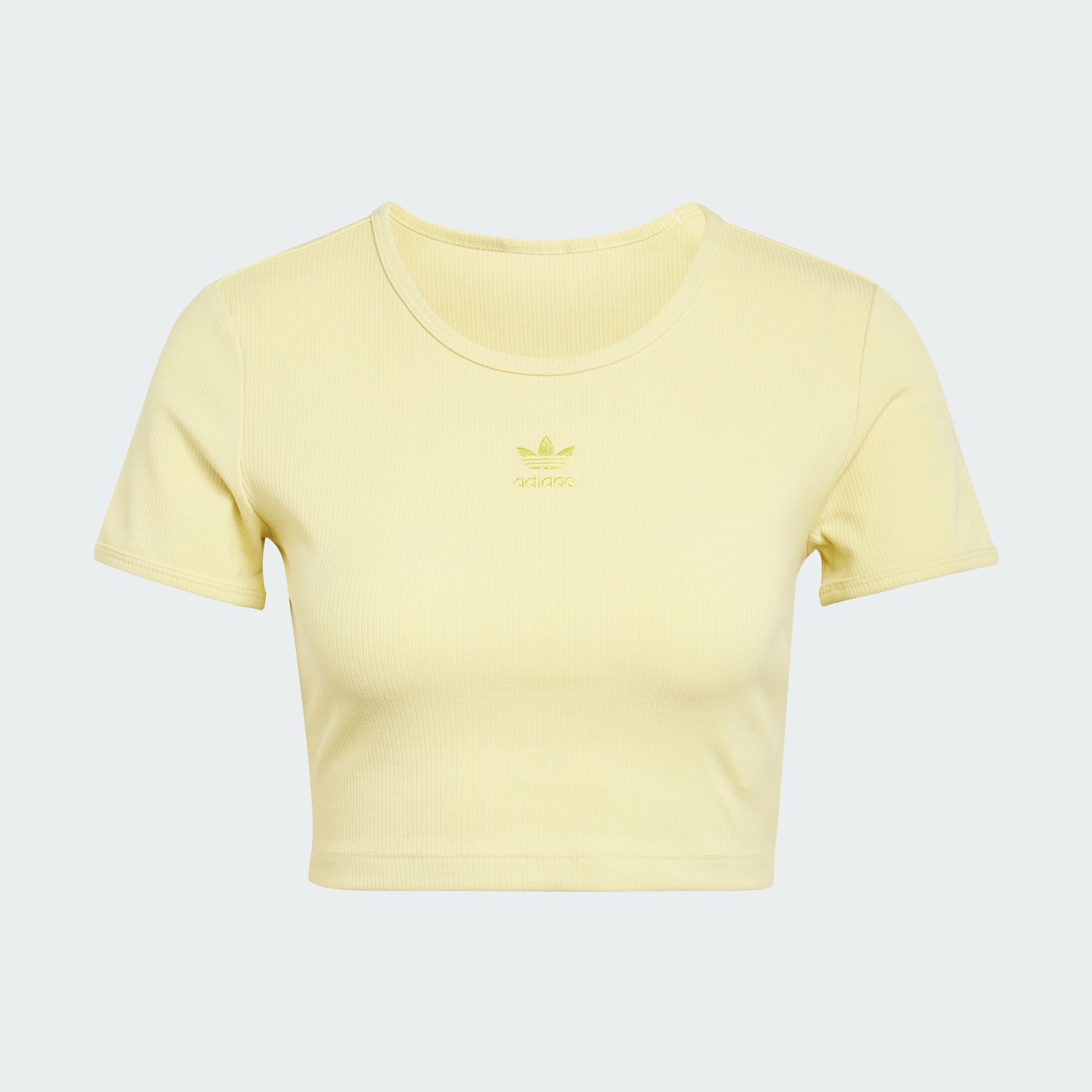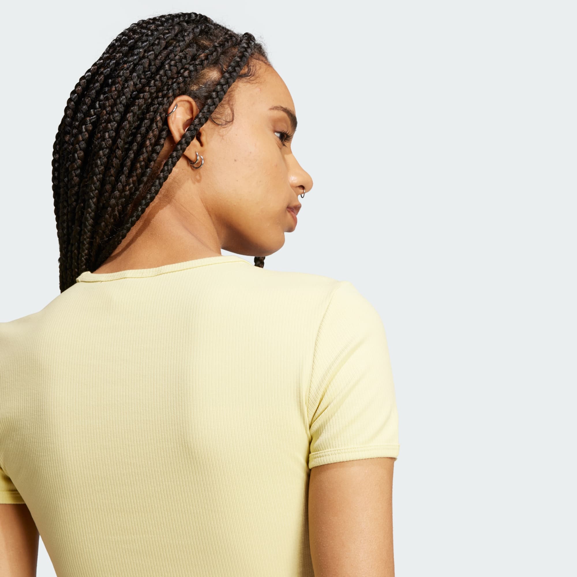 Enfile ce t-shirt adidas aux bords ajustés et profite d'un niveau de confort encore jamais atteint. La maille fine à bord-côte et la coupe slim épousent les formes de ton corps tout en offrant une totale liberté de mouvement. Sa coupe courte en fait un essentiel polyvalent parfait à porter avec un jean taille haute pour une soirée ou avec un pantalon de survêtement pour te détendre.