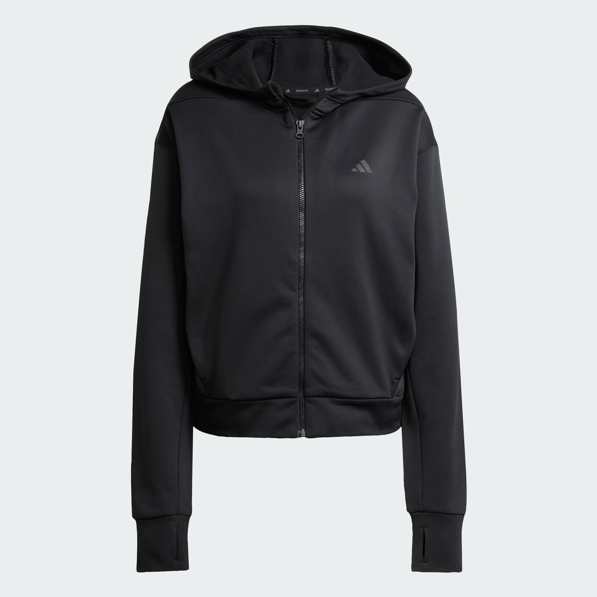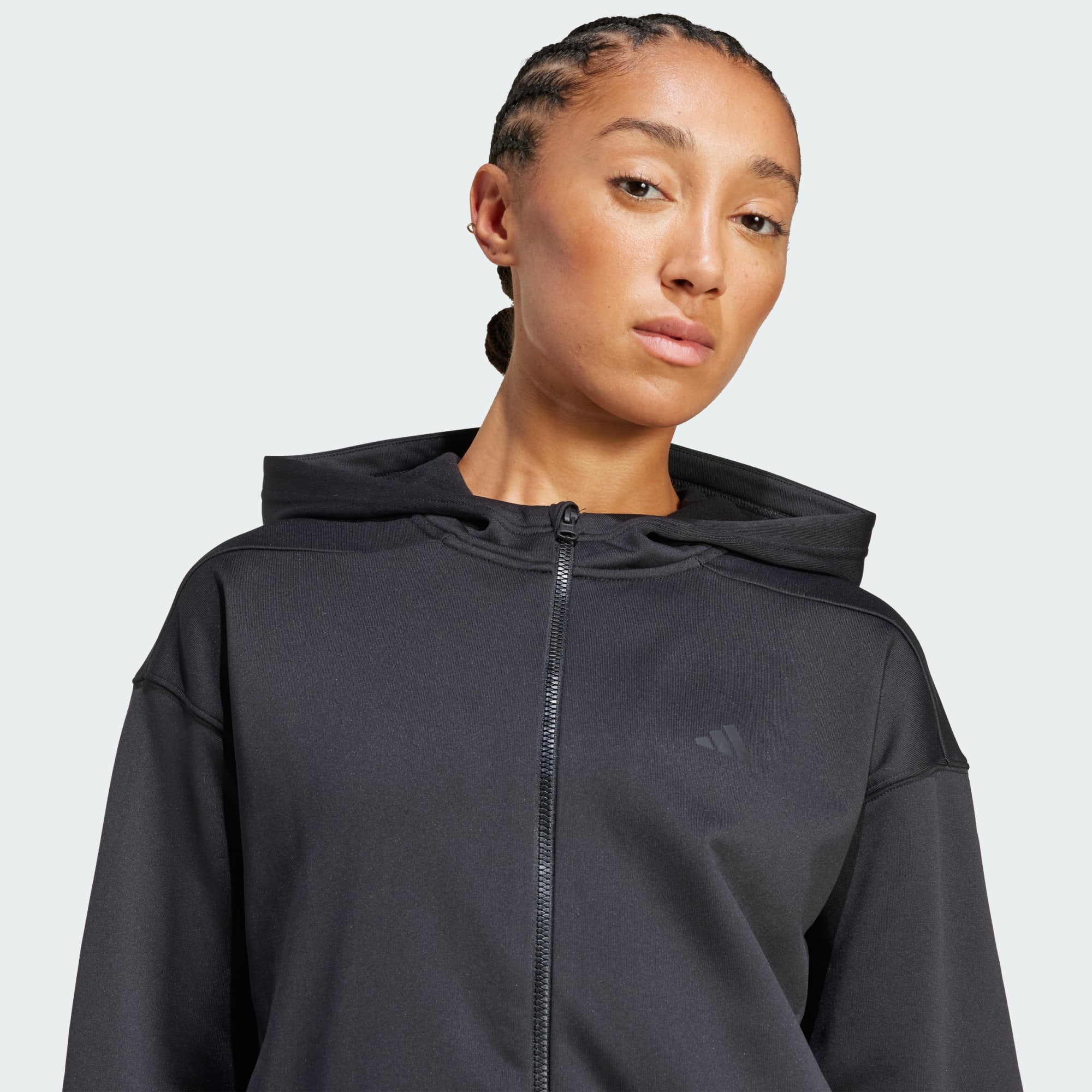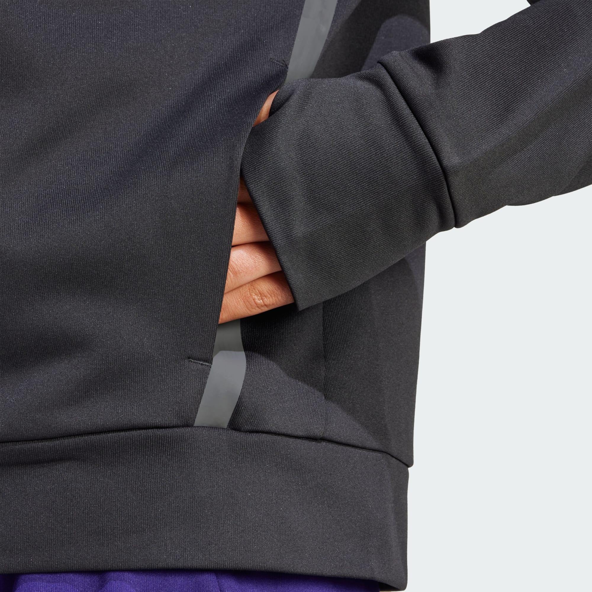 Veste à capuche avec zip intégral pour performer par temps froid.