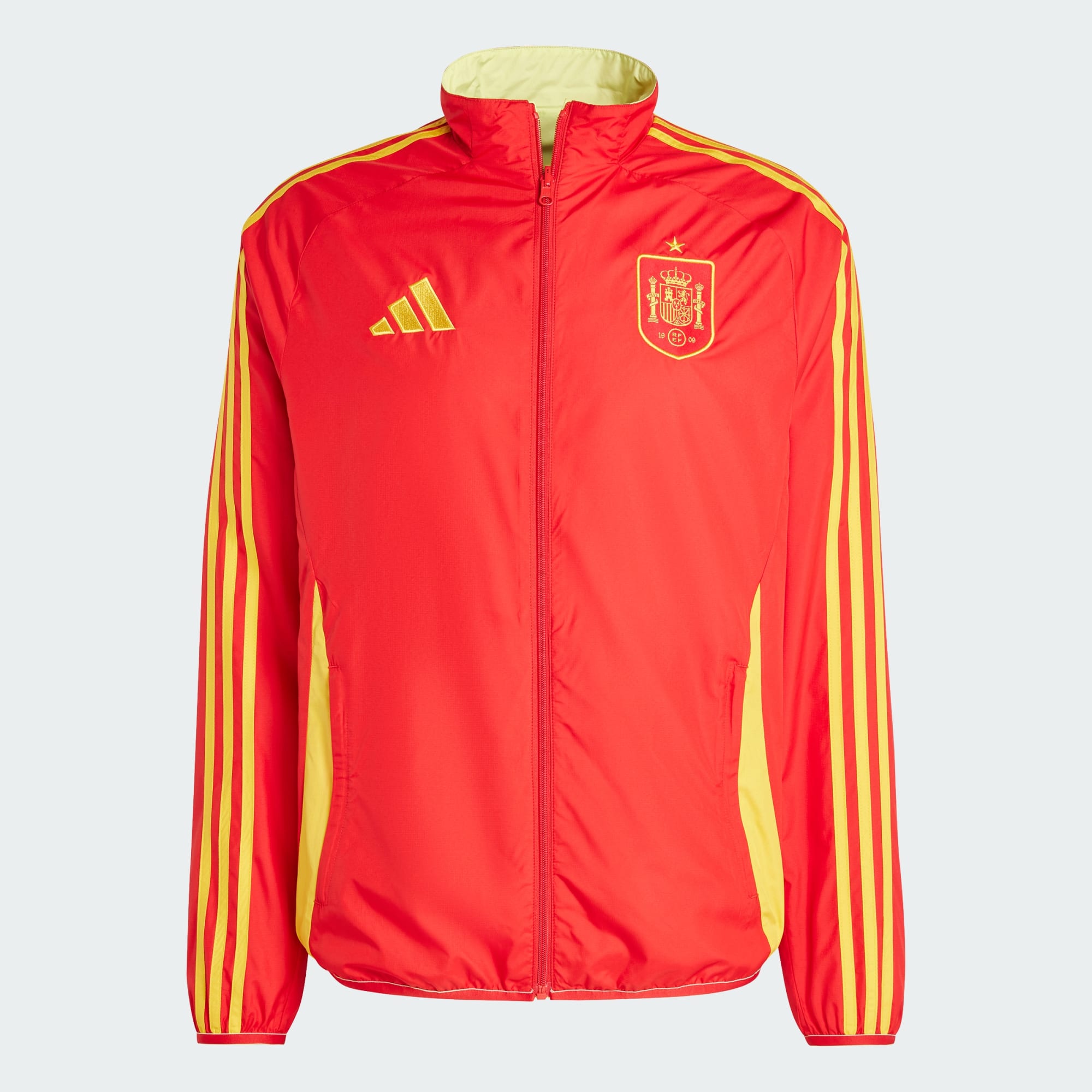 Encourage l'équipe d'Espagne avec cette veste de football prête à relever tous les défis. Elle complète les kits domicile et extérieur grâce à son design réversible. Cette veste adidas entièrement zippée est conçue en ripstop confortable. Un blason de l'équipe de chaque côté te permet d'afficher ton soutien. Ce produit est conçu avec des matériaux 100 % recyclés. En réutilisant des matériaux déjà créés, nous contribuons à réduire les déchets et notre dépendance aux ressources limitées, afin de réduire l'empreinte écologique des produits que nous fabriquons.