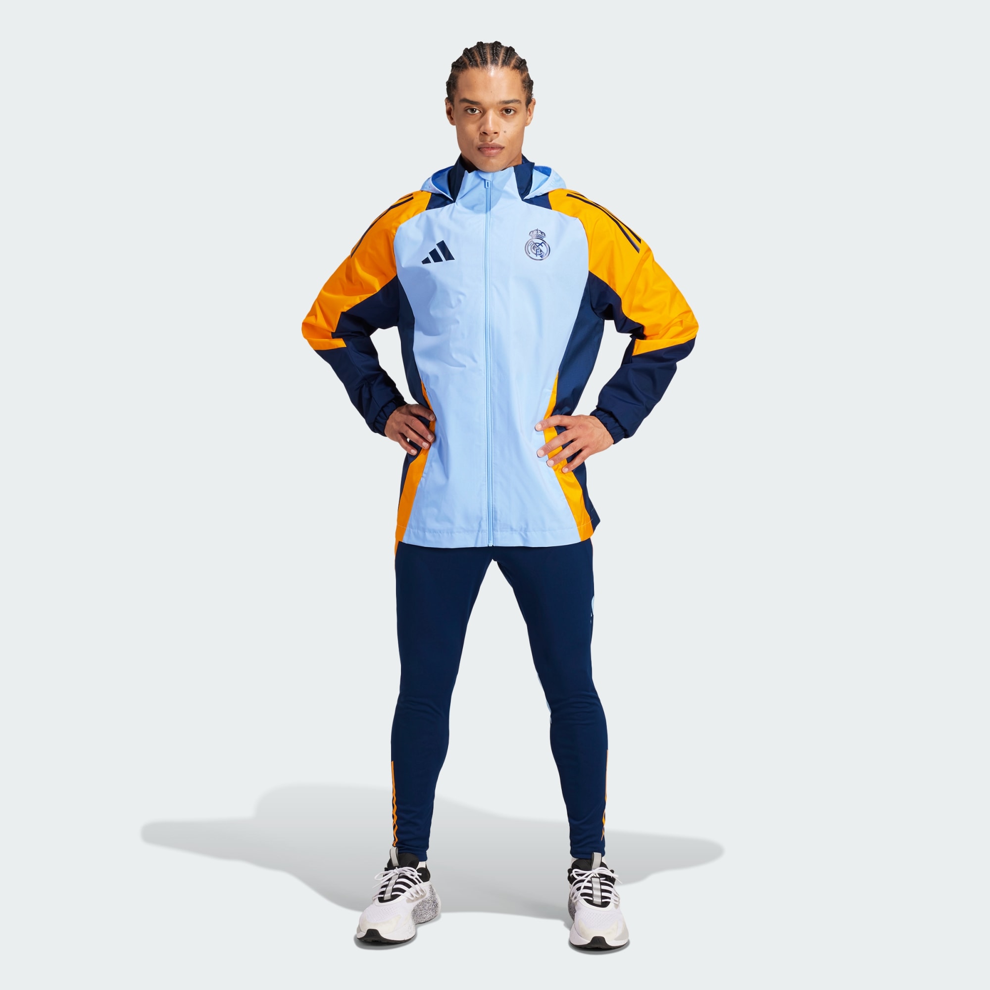 À l'approche d'un grand match, il n'y a pas de raccourci possible. Alors quand les nuages s'amoncellent sur le terrain d'entraînement, enfile cette veste Real Madrid adidas pour continuer à avancer. Sa matière déperlante te protège des éléments pendant les sessions les plus intenses. Des détails du club affichent ta passion pour le football. Ce produit est conçu avec des matériaux 100 % recyclés. En réutilisant des matériaux déjà créés, nous contribuons à réduire les déchets et notre dépendance aux ressources limitées, afin de réduire l'empreinte écologique des produits que nous fabriquons.